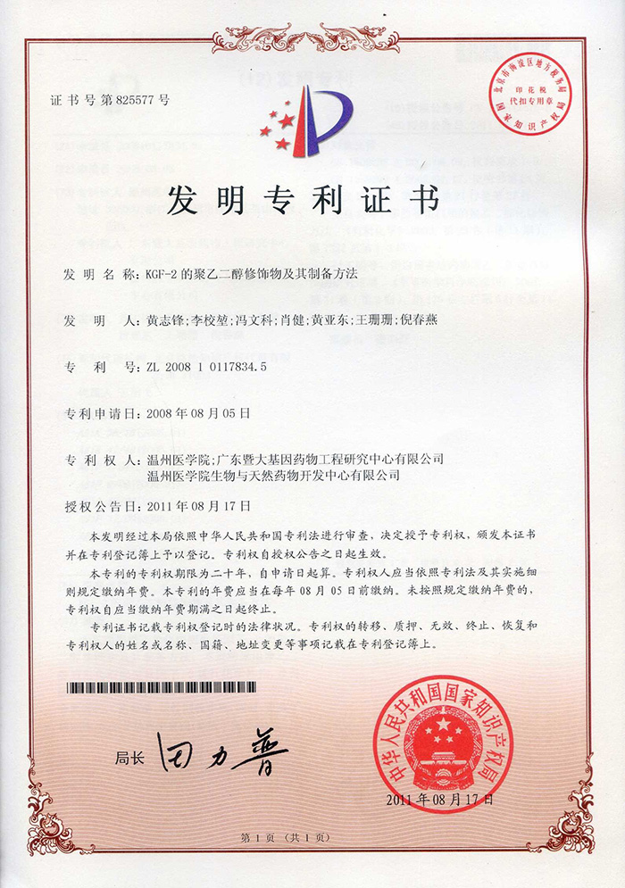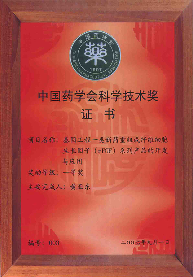 中國(guó)藥學(xué)會(huì)科學(xué)技術(shù)一等獎(jiǎng)-基因工程一類新藥重組成纖維細(xì)胞生長(zhǎng)因子(rFGF)系列產(chǎn)品的開(kāi)發(fā)與應(yīng)用
