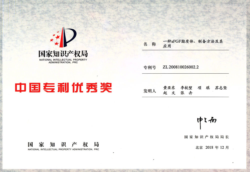 國(guó)家知識(shí)產(chǎn)權(quán)局中國(guó)專(zhuān)利優(yōu)秀獎(jiǎng)-一種aFGF脂質(zhì)體、制備方法及其應(yīng)用