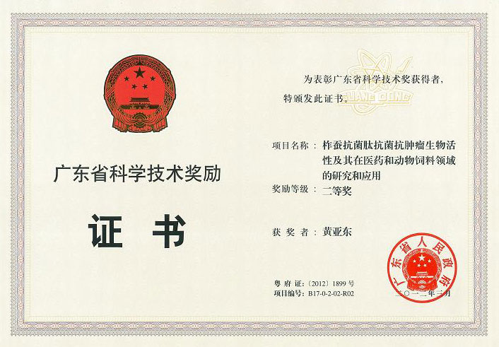 廣東省科學(xué)技術(shù)獎(jiǎng)勵(lì)二等獎(jiǎng)-柞蠶抗菌肽抗菌抗腫瘤生物活性及其在醫(yī)藥和動(dòng)物飼料領(lǐng)域的研究和應(yīng)用