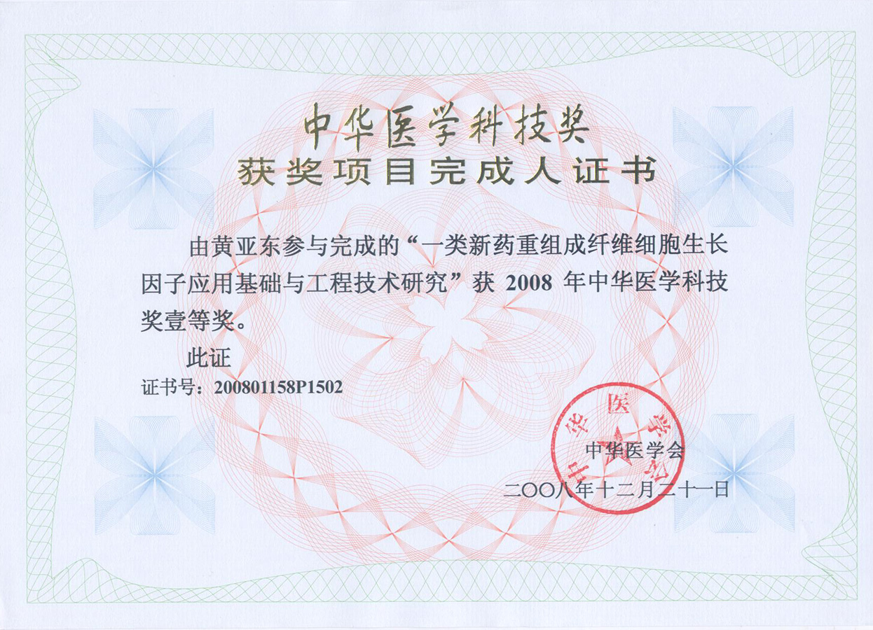 中華醫(yī)學(xué)科技獎(jiǎng)一等獎(jiǎng)-一類(lèi)新藥重組成纖維細(xì)胞生長(zhǎng)因子應(yīng)用基礎(chǔ)與工程技術(shù)研究